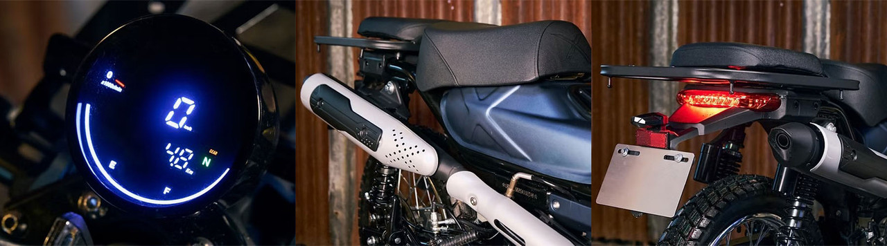 Equipada com suspensão telescópica no eixo dianteiro e duplo-choque no eixo traseiro, possui freios a disco nos dois eixos, com sistema CBS. Possui faróis full LED, partida elétrica, porta USB, possui instalado o suporte para bagageiro e painel de instrumentos em TFT de 5".