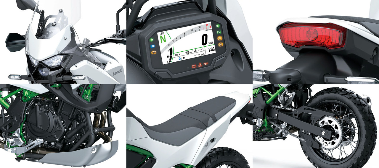 Equipada com o mesmo motor da Ninja 500, um V2 451 cc, que produz 45 cv de potência e 42,6 Nm de torque na Ninja, aliada uma transmissão de 6 velocidades com embreagem deslizante e quickshifter. Na KLE, os dados não foram anunciadas e segundo a Kawasaki, terá alterações para melhores respostas no off-road. Em termos de design, foca em versatilidade e aventura.